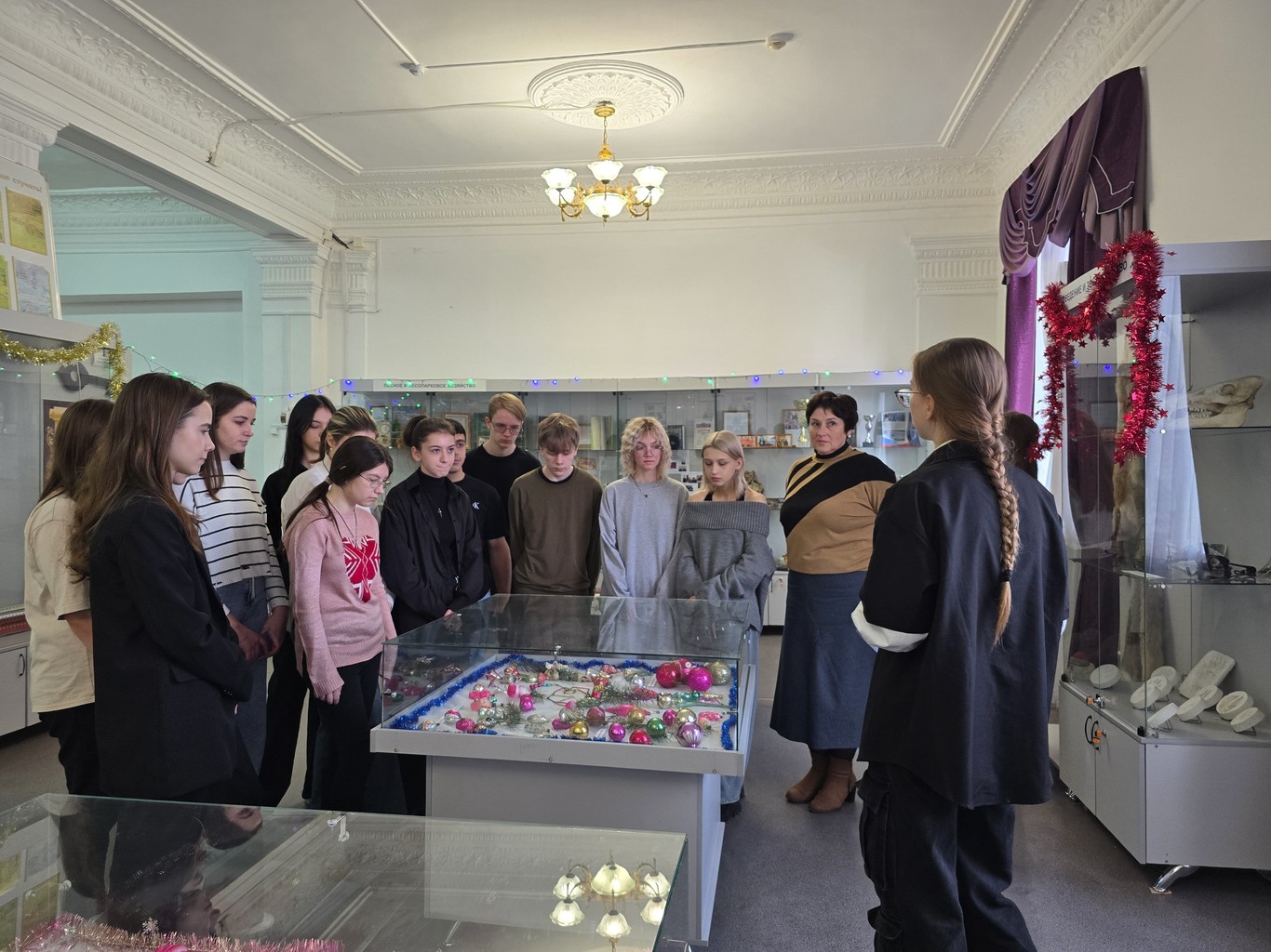 Участники кружка "Застывшие страницы истории" подготовили экскурсионное сопровождение выставки. Экскурсоводы Жукова Нина и Дорсман Яна рассказали о влиянии разных эпох на традицию оформления новогодней елки.